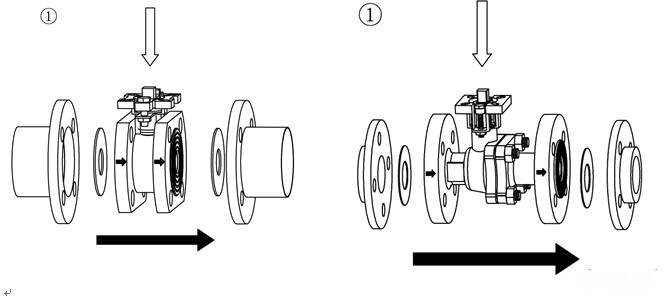 2.2.1將閥門放置于安裝的兩片法蘭之間,請務必按照介質流向安裝球閥;